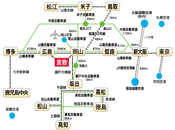 ◆交通アクセス ◇航空機での所要時間 ◇岡山空港からJR岡山駅、倉敷駅までの所要時間 ◇関西国際空港からの所要時間 ◇伊丹空港からの所要時間 |