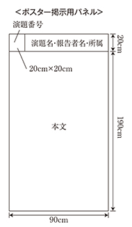 1演題あたり縦210cm×横90cmのパネルを1枚用意してあります。そのうち本文の掲示スペースは、縦190cm×横90cmです。その範囲内にポスターを掲示してください。 |