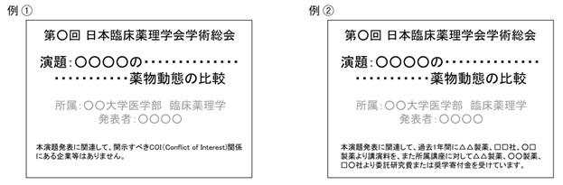 利益相反の状態について、下記【利益相反について】の例を参考に発表スライドの最初に開示してください。 |