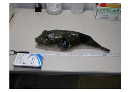 | 金魚とツノダシ(海水魚)の混泳水槽 | 飼育期間1年で950gに成長したトラフグ |