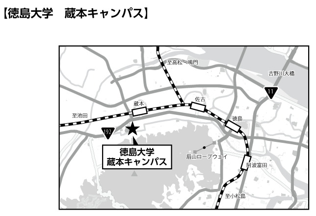徳島駅前から「鴨島方面」行・「石井循環線(右回り)」に乗車し、「蔵本中央病院・大学病院前」又は「医学部前」で下車、徒歩約2分