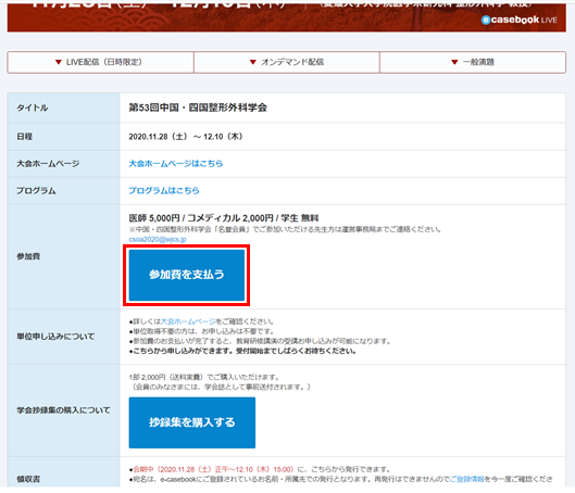 | 4. | ログインいただくと、下記の通り、参加申し込みページにアクセスいただけますので、「参加費を支払う」よりお支払い(クレジットカード決済のみ)をお願いいたします。 |