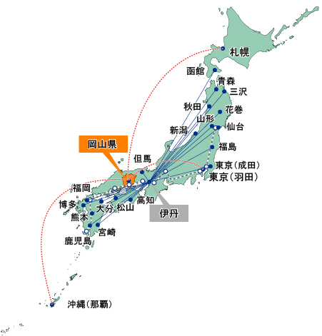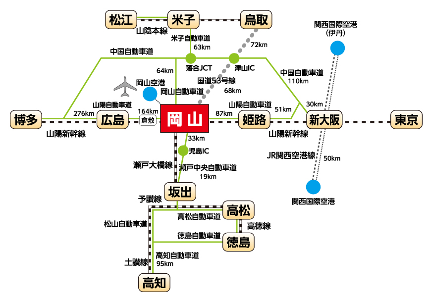 ◆交通アクセス ◇(岡山空港での)航空機での所要時間 ◇岡山空港からJR岡山駅、倉敷駅までの所要時間 ◇関西国際空港からの所要時間