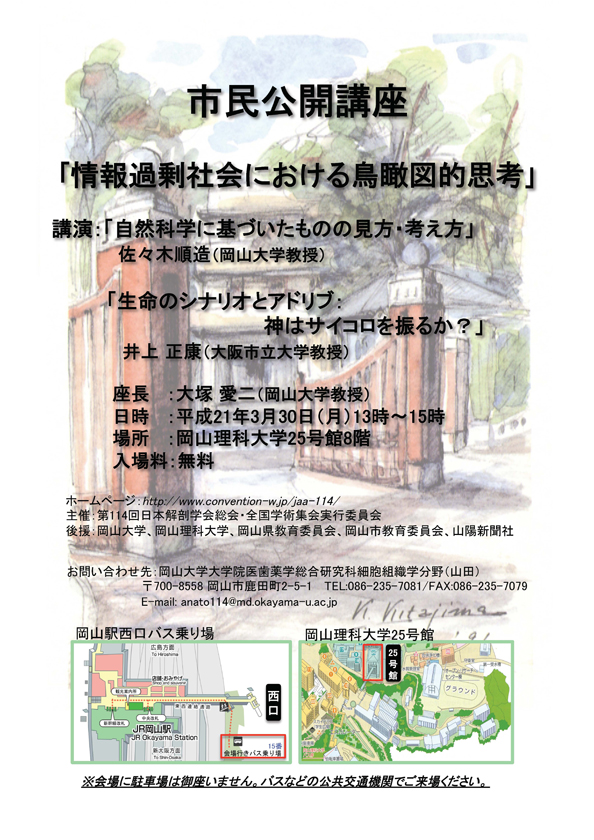 ●市民公開講座 日 時:2009年3月30日(月) 13:30〜15:30 会 場:学校法人 加計学園 岡山理科大学 座 長:大塚 愛二 講 演:「自然科学に基づいたものの見方・考え方」 「生命のシナリオとアドリブ:神はサイコロを振るか?」 |