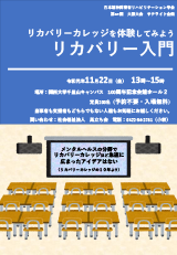 | リカバリーカレッジを体験してみよう 「リカバリー入門」 定員:200名 予約不要 入場無料 当事者も支援者もどちらでもない人たちもお気軽にお越しください。 お問い合わせ:社会福祉法人 巣立ち会 電話:0422-34-2761(小林) |