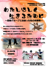 | 「わたしらしく生きるために ~自助グループと出会った私の体験談~」 申し込み不要 参加費無料 会場へ直接お越しください。 お問い合わせ:新阿武山病院 医療福祉相談室 電話:072-693-1881(担当:亀ノ上) |