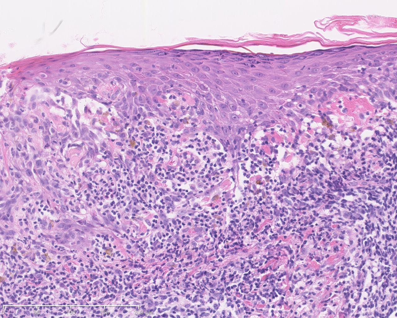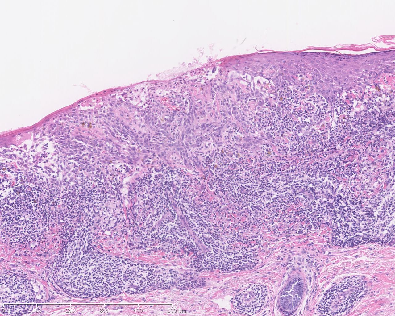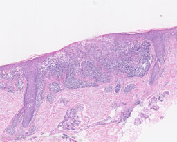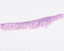 57歳女性。以前から左外眼角に淡褐色斑(長径1cm)があり,老人性色素斑と考えて経過観察中であったが小丘疹が現れたため色素斑全体を切除した。