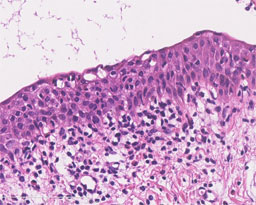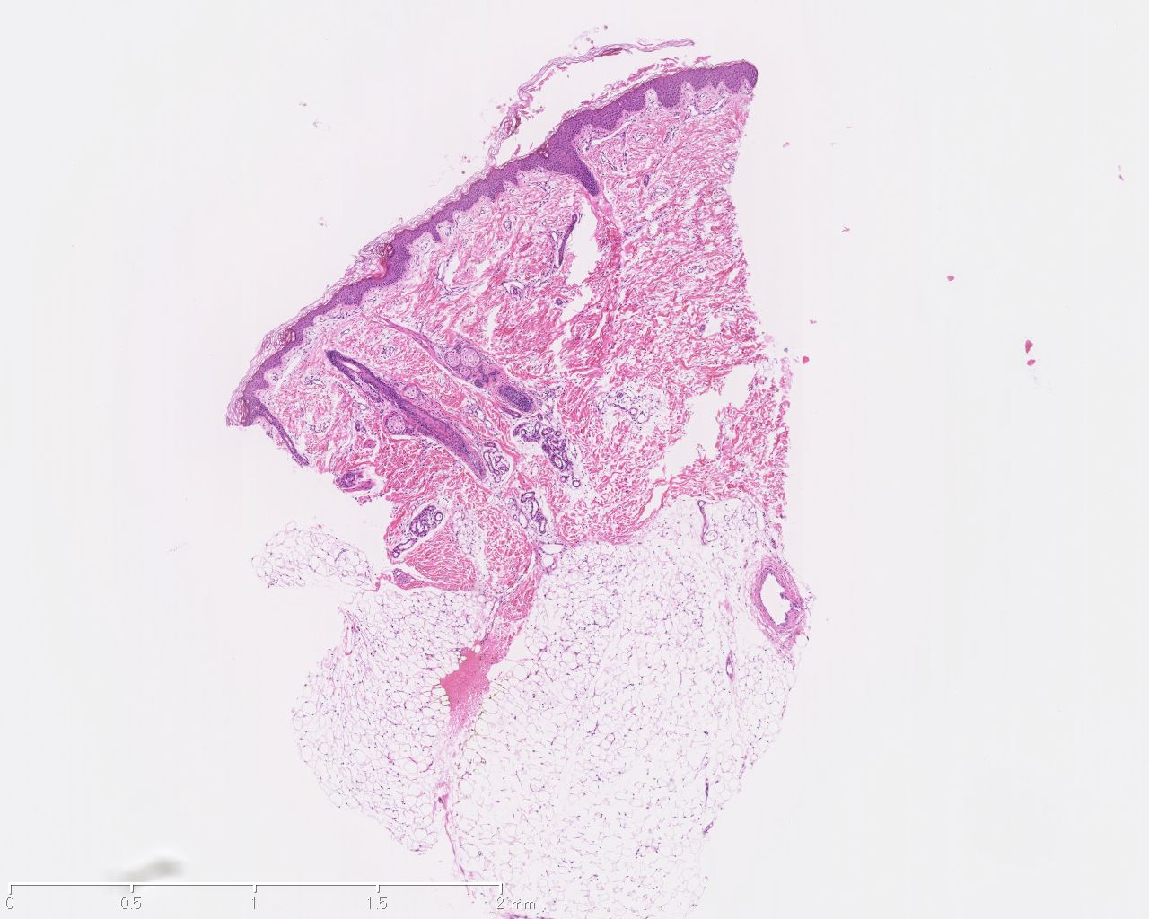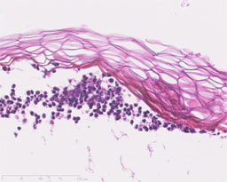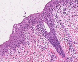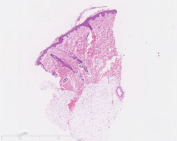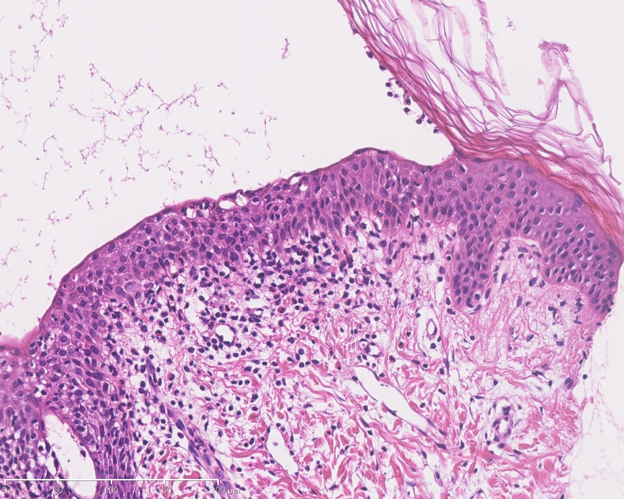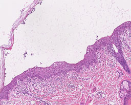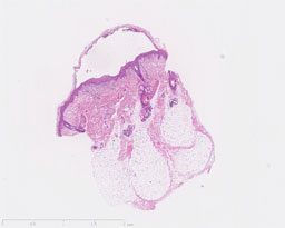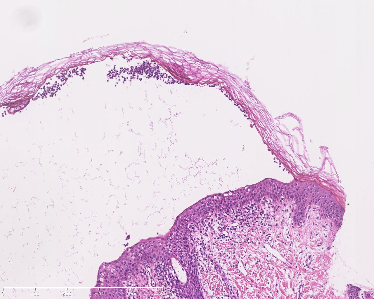 生後1日、女児。主訴:顔面および体幹の小水疱、小膿疱。現病歴:在胎37週5日、帝王切開分娩。出生時から顔面、体幹に小水疱、小膿疱が散在している。先天性表皮水疱症を疑われて当院NICUに紹介された。既往歴:特別なことはない。家族歴:特別なことはない。現症:左前額部に小水疱および小膿疱が散在、左頬部に紅色丘疹が1個存在、左前胸部に紅色丘疹および水疱が散在している。