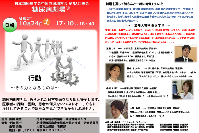 | 演者: | 手納 信一(島根県糖尿病療養指導士認定機構 研修委員長) 白石 美保(大田市立病院 看護部) 劇団・縁(えにし) 島根県LCDEチーム |