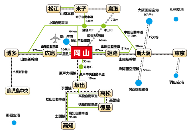 ◆交通アクセス ◇航空機での所要時間 ◇岡山空港からJR岡山駅、倉敷駅までの所要時間 ◇関西国際空港からの所要時間 ◇伊丹空港からの所要時間 |