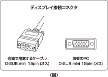 | 4) | PC本体持込の場合の注意点 Windows、Macintoshの双方とも映写可能ですが、解像度1024×768ドット、ディスプレイモードXGAまでとお考えください。使用するアプリケーションはPowerPointのみとさせていただきます。また、できる限りWindowsコンピューターの使用をお勧めします。出力コネクターとの接続は、「D-Subミニ三列15ピン型(5個のピン穴が3段になっているもの。図参照)」を用意しております。 上記以外のコネクター形状をお持ちの方は、変換コードをご用意ください。なお、PC本体持込の場合でも、CD-ROMまたはUSBメモリでのバックアップ用データをご持参ください。また、パソコンのACアダプターは必ずご持参ください。 ![]() |