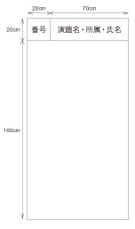 | 2) | 1題当り縦180cm×横90cmの展示スペースです。各演者は指定の場所に、図の要領で表題、氏名、所属を表示してください。演題番号および取り付け用画鋲は運営事務局で用意します。 | ||||