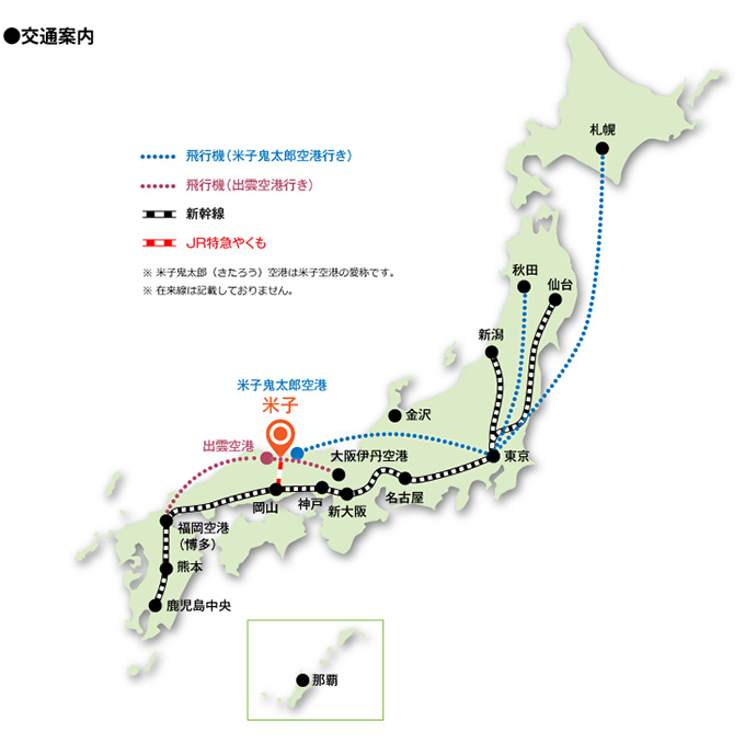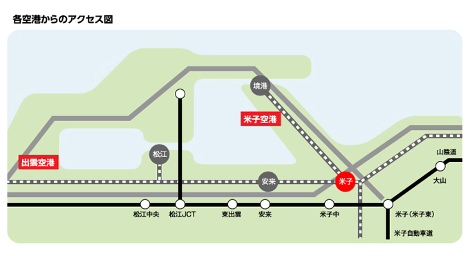 | ● | 米子自動車道米子I.Cから山陰自動車道(松江方面行き)経由 米子中I.Cから車で約5分 ※松江方面からお越しの場合は、 米子西I.Cを下りてください。 |