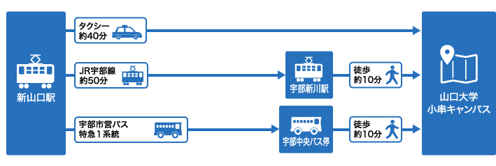 「山口大学医学部正門」もしくは「医学図書館」と伝える。