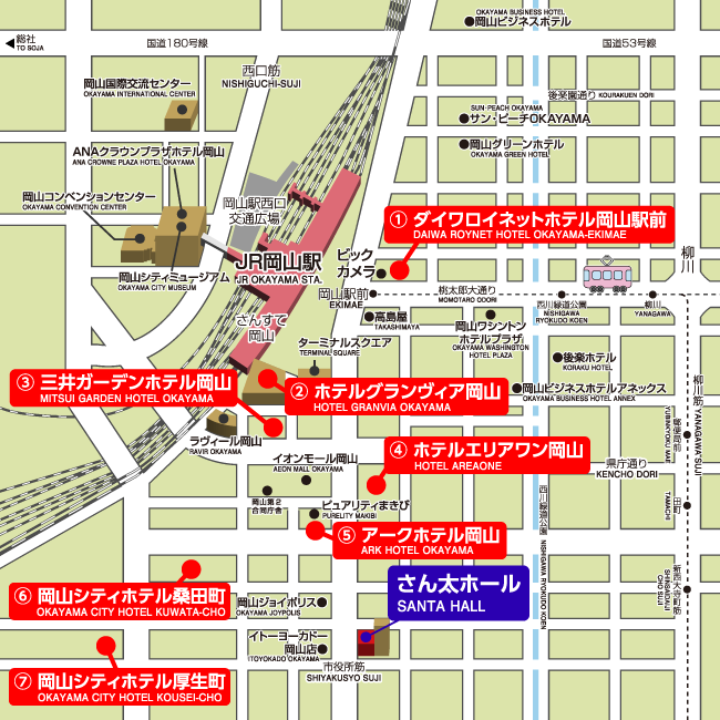 | ① | ダイワロイネットホテル岡山駅前 | http://www.daiwaroynet.jp/okayamaekimae/ |