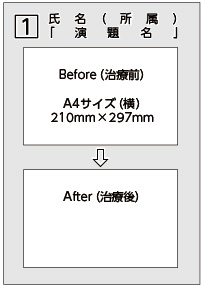 | (1) | A4サイズ(横)で2枚(最初と最終経過時のレントゲンなどの画像所見)を上下に掲示してください。 また、写真(治療後)下に症例解説文等の掲示を希望される場合も各自でご準備いただき(A4程度の大きさ)、貼付をお願いします。 |