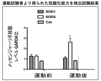 活性酸素を分解する酵素であるスーパーオキシドディスムターゼ2(Superoxide dismutase,SOD2)の上昇を確認できました。これは私たちが以前に行った4週間の運動試験で得られた見地の続報となる試験ですが、運動週間の獲得が抗酸化能力の上昇に強く関わる可能性を示唆しています。