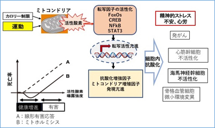 そもそも活性酸素の何がいけないのかについてですが、細胞に影響を与え生体組織として抗酸化能力を超えた時に、肥満、糖尿病、動脈硬化などの疾病が発症すると考えられています。私たちがこの度の試験で得られた結果から、カロリー制限や運動トレーニングは、細胞内のエネルギー産生場所であるミトコンドリアから一時的に活性酸素を産生させますが、