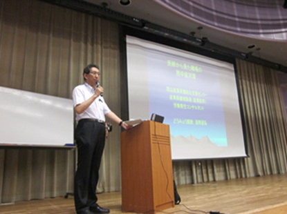 小生は、数ヶ所の事業所の産業医の傍ら、岡山産業保健総合支援センター産業医学相談員と日本労働安全衛生コンサルタント会岡山支部副支部長を以前よりしていて、そのことに関しての報告をします。岡山県では労災件数は漸減していましたが一昨年急に増加し昨年も増加したため、岡山労働局等が危機感を覚え、昨年は特に増加している岡山労働基準監督署、倉敷労働基準監督署管内で「安全塾」を7月から各々計3回ずつ行い、産保センターを通じて、小生は第1回目の講師が当たり、「熱中症対策について」を岡山と倉敷で講演しました(写真)。最近の猛暑で、岡山県では熱中症での労災申請も多くなっているとのことです。今年も注意が必要です。