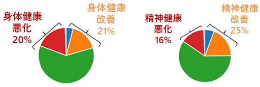 このような働き方の変化は、コロナ後にも定着するのではないかと想像しております。 現在、飲食・観光業や航空や電車等の運輸業など感染症に関係する業種に働く人々には大きな逆風になっておりますが、元に戻るには少なからず時間を要すものと思います。これらの人々の間ではメンタルヘルスや運動量の低下による生活習慣病の悪化等様々な健康問題も明らかとなっております。