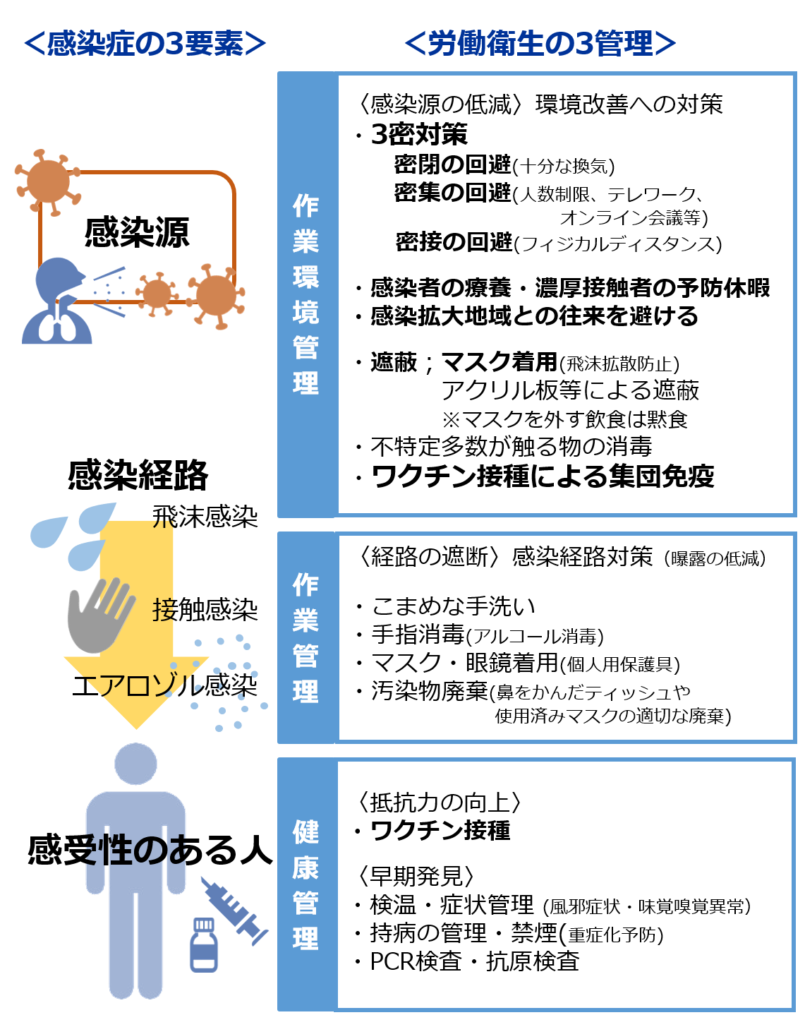 身近な新型コロナ感染症対策である検温やマスク着用はもちろん重要ですが、もし作業環境管理が不十分であれば、作業管理と健康管理に大きな力を注いでも、効果が限定的であることがよくわかるはずです。職場教育を徹底し、職場に新型コロナウイルスを持ち込ませない(職員に感染リスクの高い行動を控えてもらう)、またワクチン接種により集団免疫を作ることが最も重要な新型コロナ感染症対策の第一歩と考えています。