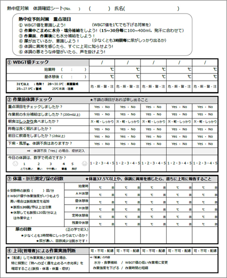 作業前体調チェック:脱水、体温上昇しやすい生活習慣や体調不良の有無を確認する。同時に日々の生活習慣改善の意識付けを行う。 |